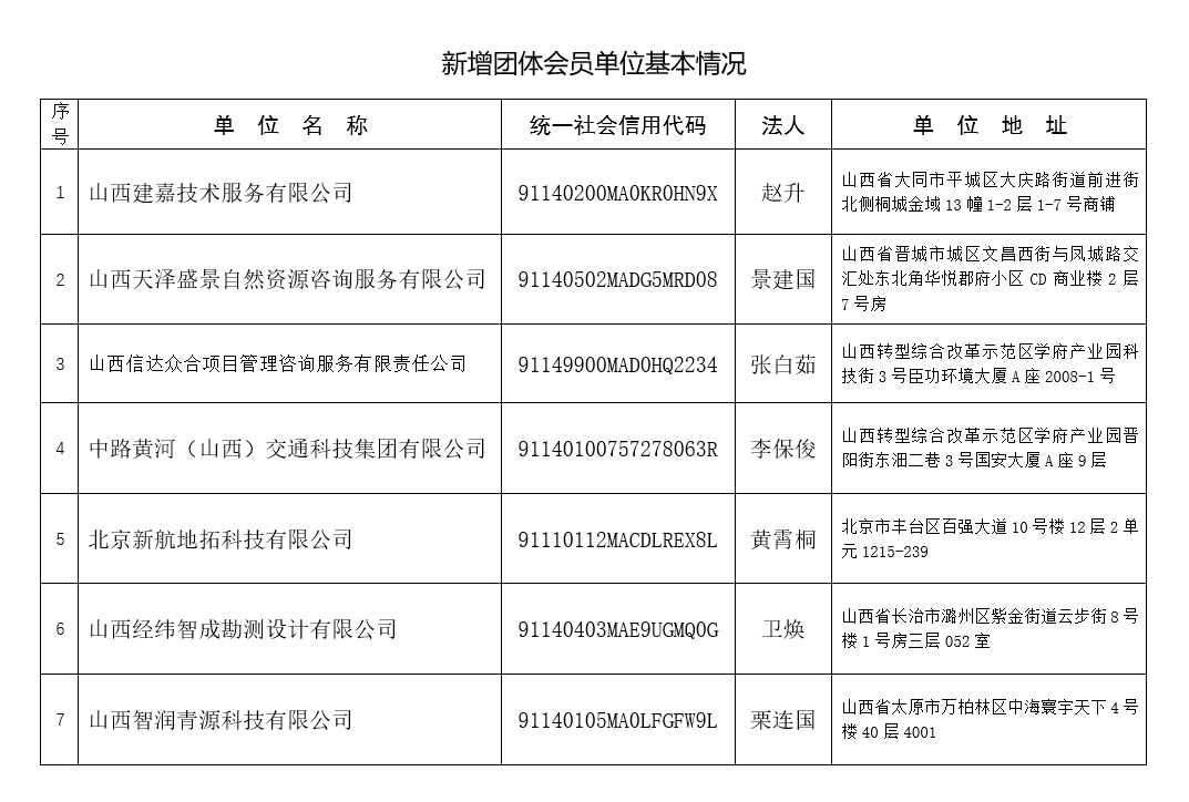 依据山西省土地学会章程有关规定,经会议研究决定,吸收从事土地相关业务的山西建嘉技术服务有限公司等7家单位为山西省土地学会团体会员。